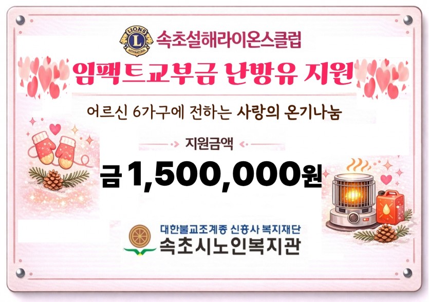속초설해라이온스클럽 페이지 정보 작성자 속초설해 댓글 0건 조회 195회 작성일 26-02-11 19:59 본문 24-25LCIF 임팩트교부금 속초시 노인복지관 어르신6가구에 가구당 25만원씩 1,500,000원 난방비 지원했습니다 목록 이전글원주 백산클럽 재가노인 도시락 배달봉사 26.02.13 다음글원주 백산클럽 밥상공동체 종합사회복지관 배식봉사 26.02.10