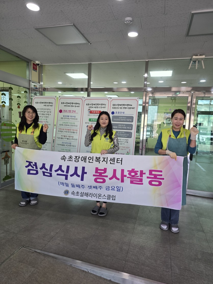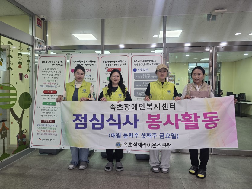 속초설해라이온스클럽 페이지 정보 작성자 속초설해 댓글 0건 조회 16회 작성일 26-03-31 09:45 본문 매월 둘째,셋째주 금요일 속초장애인복지센터 점심봉사 목록 이전글춘천봄내클럽-사랑의 빵 봉사 나눔봉사 26.04.01 다음글"원주한마음클럽 삼단지팡이(100만원 상당)봉사" 26.03.30